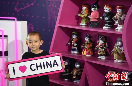 8月23日,一名小朋友在“民族风”机器人展区与展品合影。当天,2019njwgl继续在北京亦创国际会展中心举行。(中新社记者 侯宇 摄)