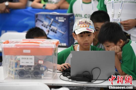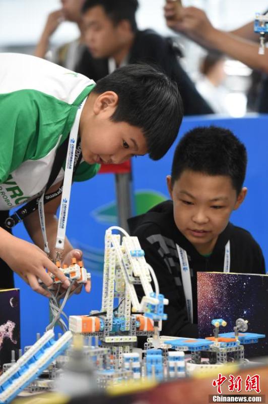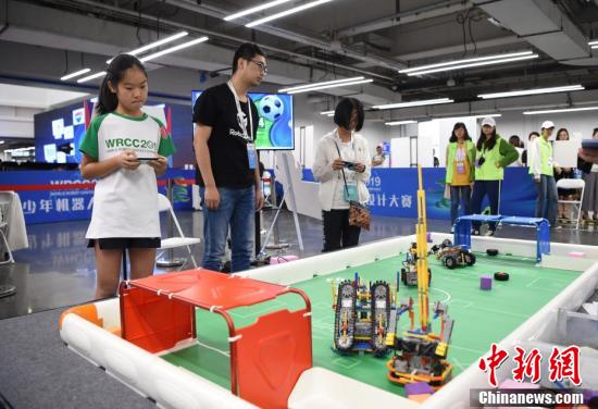 两名小选手在201918luck新利首页“青少年机器人设计大赛”中操控自己设计的机器人。